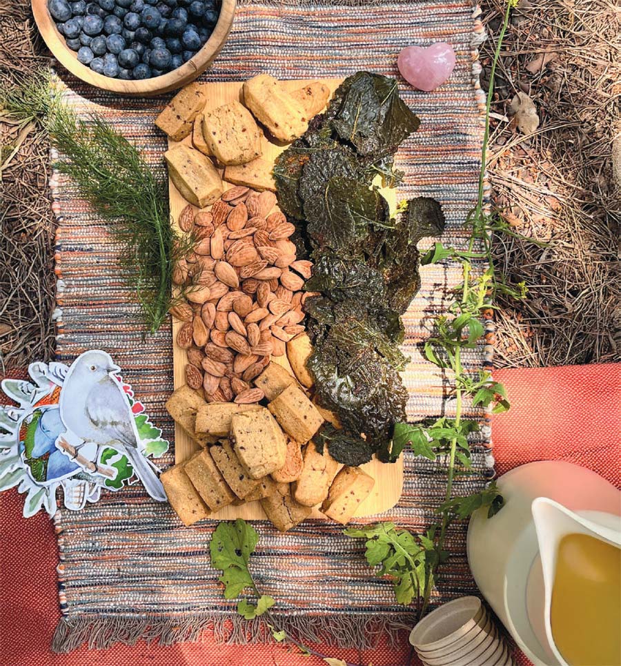 The session culminates in a celebratory time of food and drink, to help us transition out of the dreamlike state and add the final and arguably most pleasant sense to the experience: taste. A simple tisane, made with herbs from Deborah’s garden or plants she foraged from the area during the session and steeped into a thermos of hot water, offers refreshment and its own health benefits, in the form of antioxidants.
